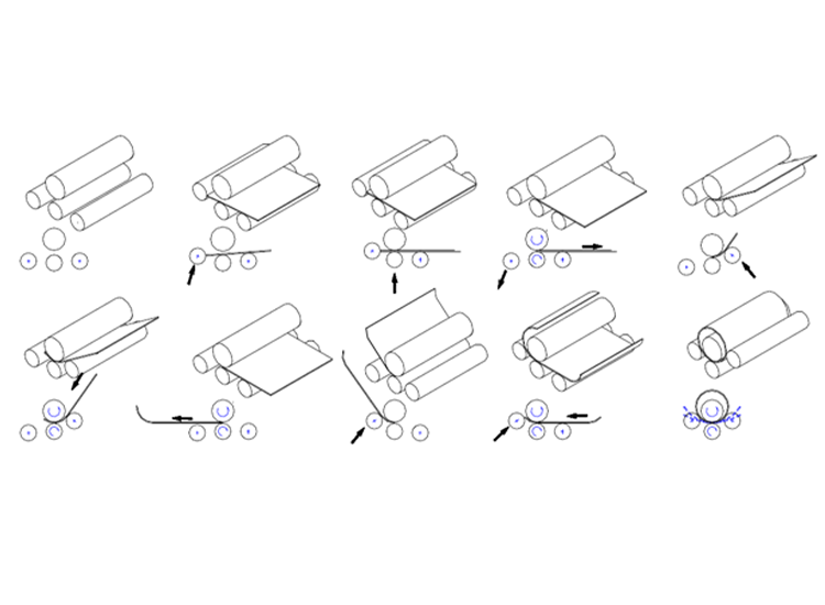 Oprema je opremljena s funkcijo prednega upogibanja konca pločevine, kar omogoča vstavljanje kovinske pločevine v enem kosu, pri čemer se prednje upogibanje konca pločevine ter valjanje in oblikovanje izdelka izvedejo brez spremembe smeri.